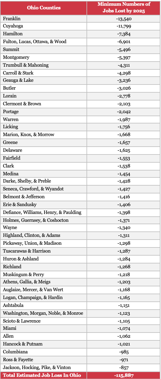 The Economic Research Center’s analysis was conducted by applying the CBO findings—which estimated that 5.2 percent of workers earning a little more than $15 an hour or less than $15 an hour would lose their job if the minimum wage increase was imposed—to Ohio Census Bureau regions (the most reliable available data on how much workers make in that region) to estimate the minimum number of jobs lost by 2025, when the proposed wage hike would fully take effect. The Buckeye Institute analysis shows that nearly 116,000 Ohioans would lose their jobs if Congress adopts this $15 an hour minimum wage hike.