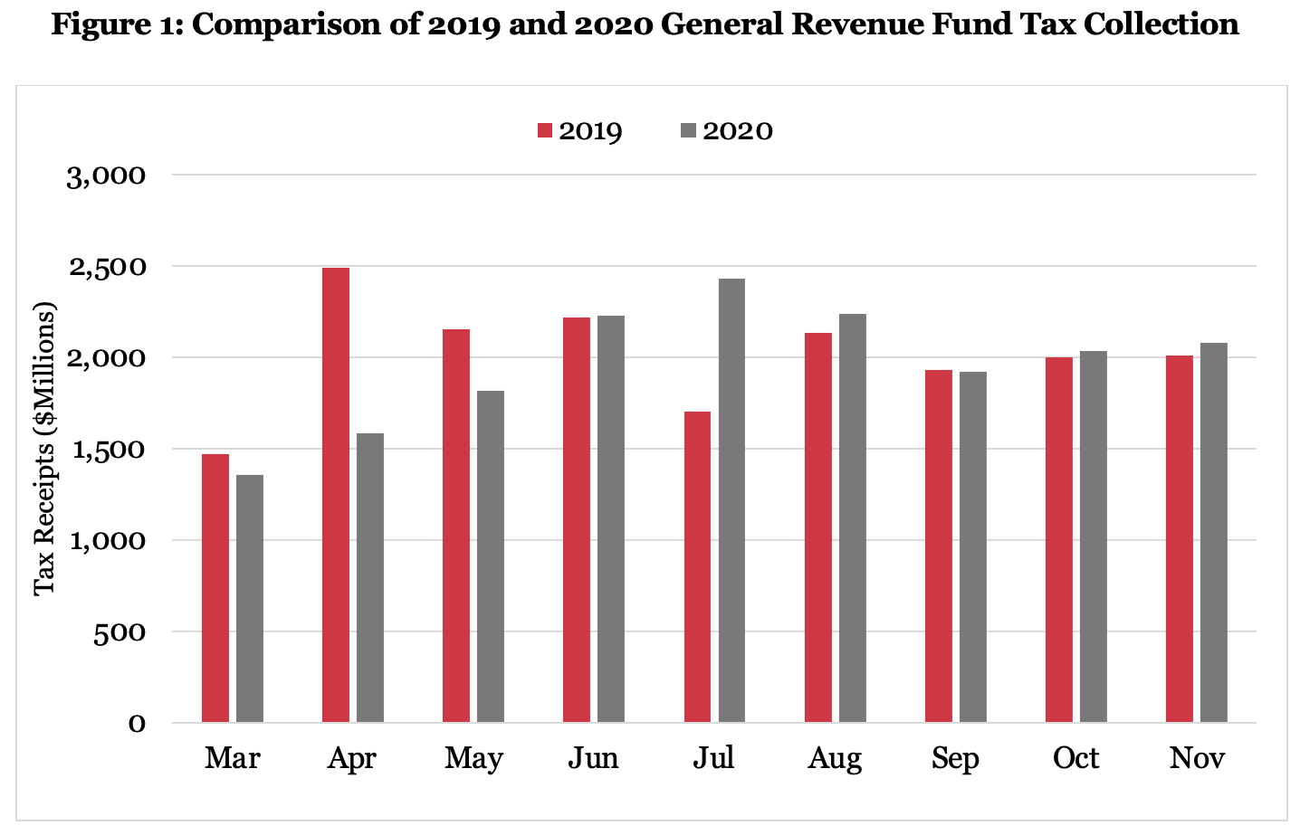 In A Case Study from the Heartland, Kolas looks at how Ohio’s tax collections have performed since the start of the pandemic compared to 2019. Over the past nine months, Ohio’s tax collections have dropped less than 2.3 percent compared to 2019, which—with an untapped rainy day fund—places the state in sound fiscal shape heading into budget discussions early next year, if Ohio can keep the pandemic at bay and avoid further economic disruptions.
