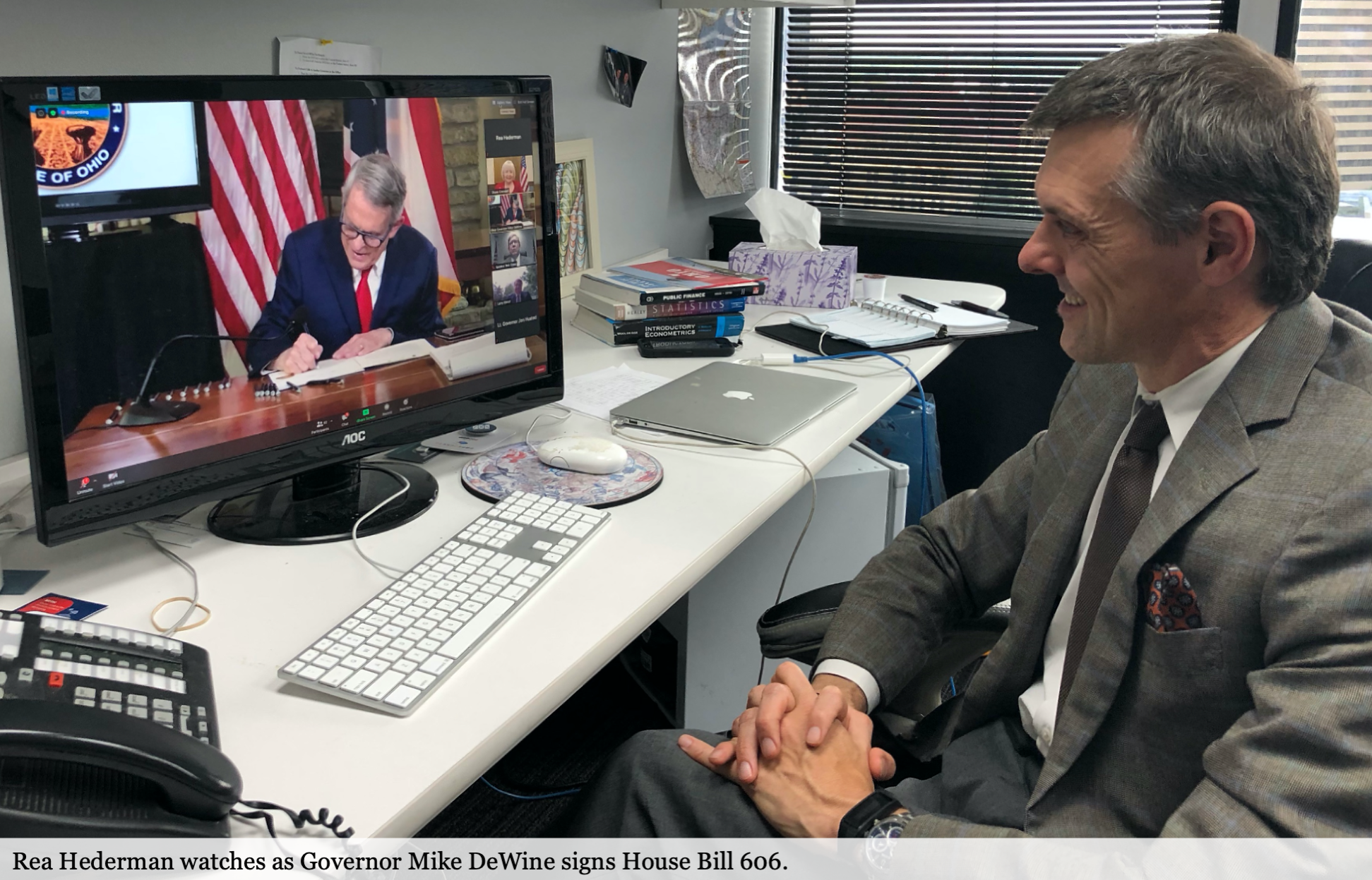 Columbus, OH – Rea S. Hederman Jr., executive director of the Economic Research Center at The Buckeye Institute and vice president of policy, issued the following statement on the signing of Ohio House Bill 606—which provides businesses, schools, and frontline workers with critical liability protections from COVID-19 lawsuits. Hederman and Greg R. Lawson, a research fellow at The Buckeye Institute, attended the virtual signing ceremony at the invitation of Governor DeWine.